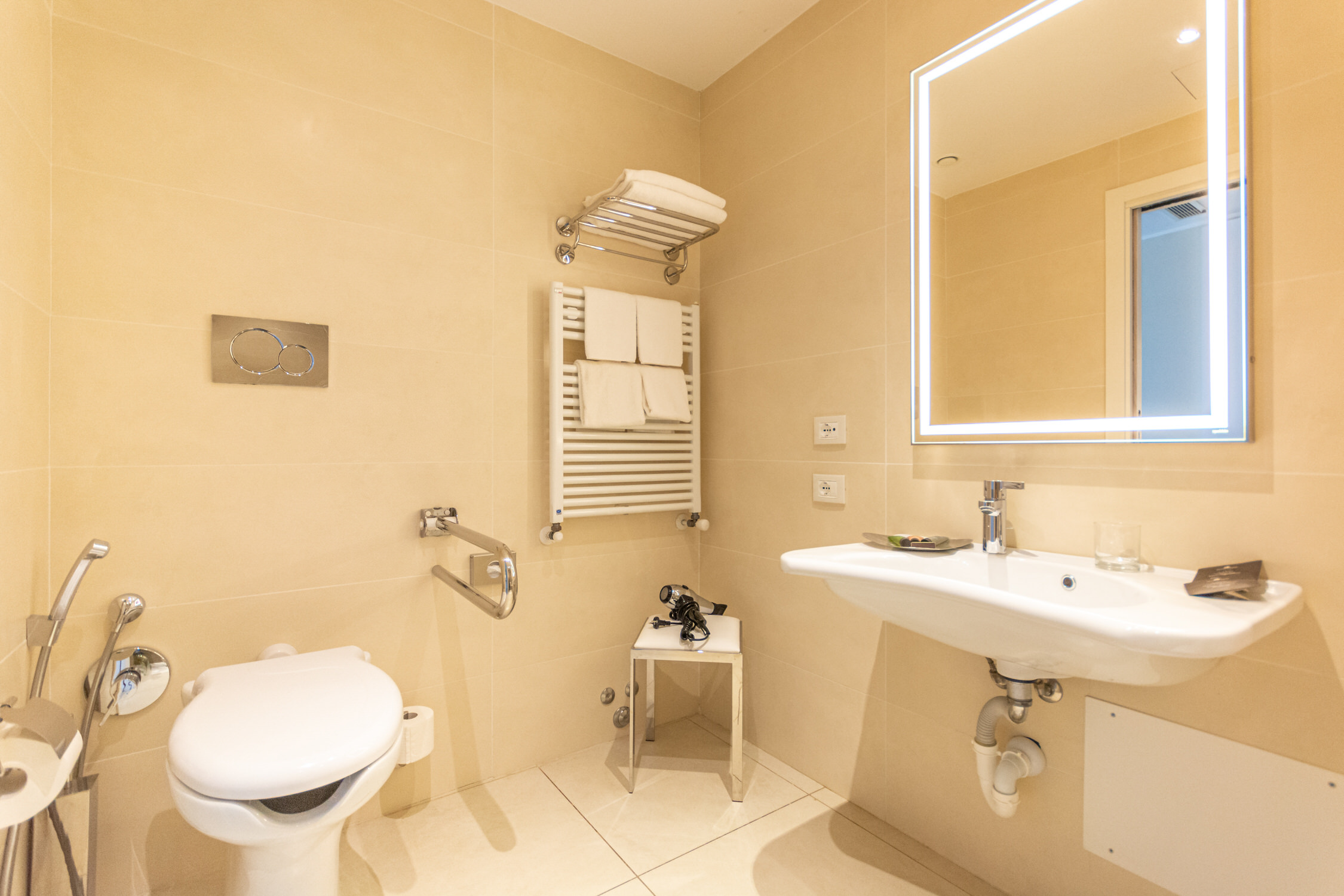 Das bedingt barrierefreie Doppelzimmer Comfort im Hotel Capo Nord verfügt über: 1 Schlafzimmer mit Doppelbett oder zwei Einzelbetten, Minibar, Telefon, Safe, Schreibtisch, 1 Badezimmer mit Dusche und 1 ausgestatteter Balkon.