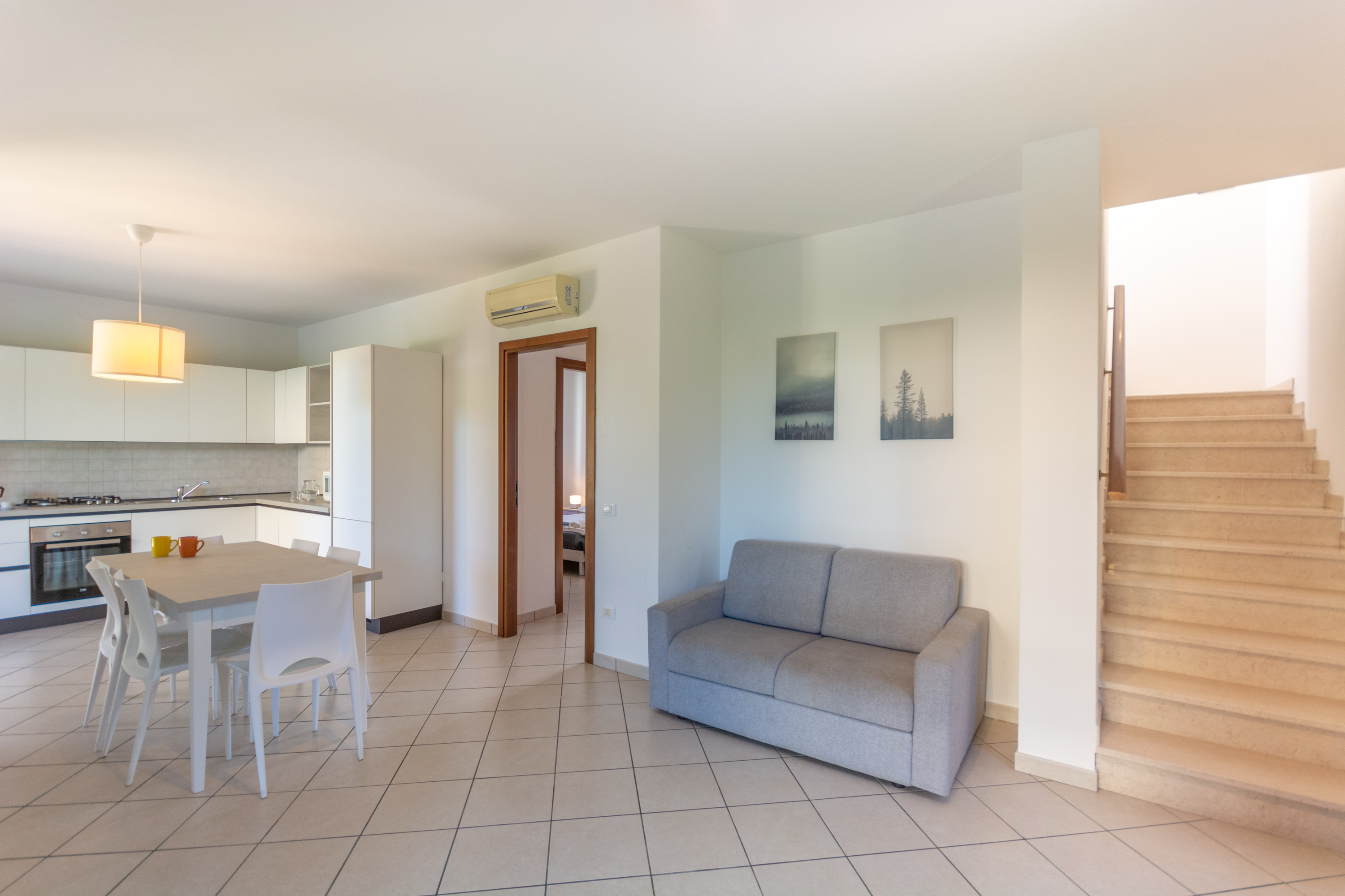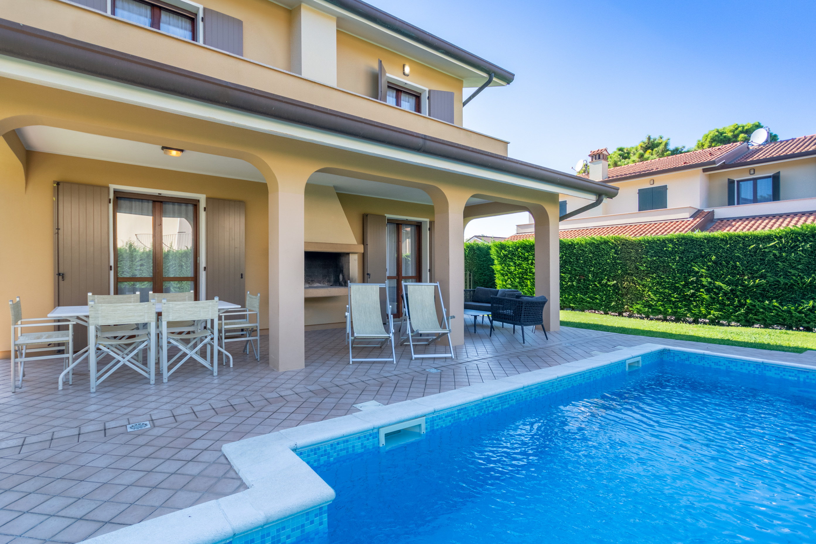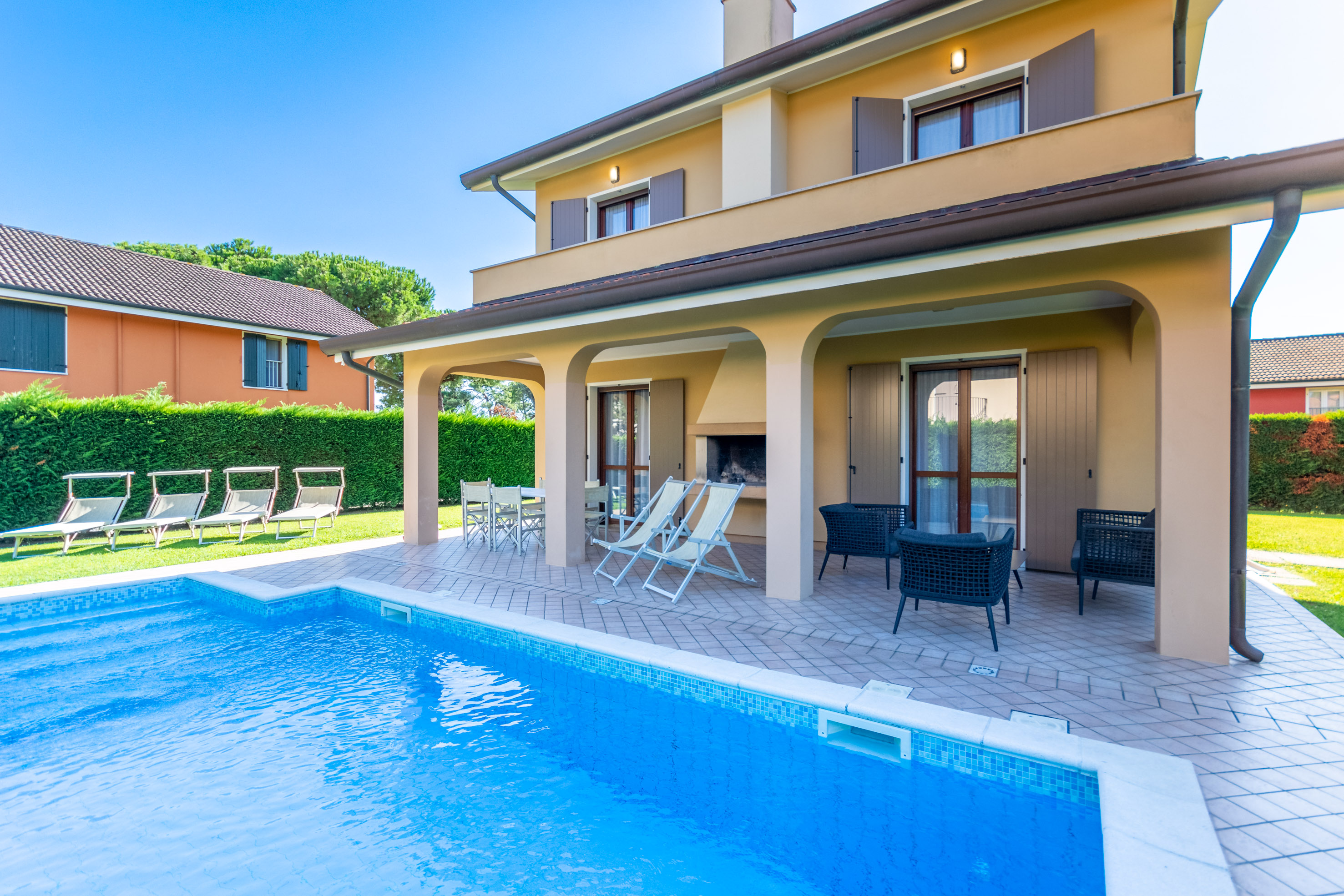 Das zweistöckige 5-Zimmerhaus (Doppelhaushälfte in der 3-Villengruppe) verfügt im Parterre über: 1 Wohn-/Esszimmer mit Kochnische, 1 Schlafzimmer mit Doppelbett, 1 Badezimmer mit Dusche und Waschmaschine, 1 ausgestatteter Gartensitzplatz mit Privatpool und 1 gedeckte Terrasse oder Balkon. Im 1. Stock über: 1 Schlafzimmer mit Doppelbett, 1 Schlafzimmer mit je 2 Einzelbetten, 1 Schlafzimmer mit je 2 Einzelbetten oder Doppelbett, Safe, 1 Badezimmer mit Dusche.