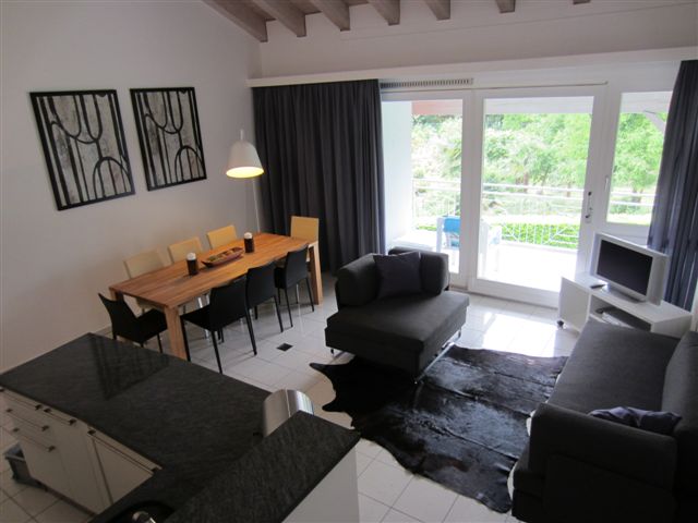 Das 2,5-Zimmer Komfort Apartment im 2. Stock verfügt über: 1 Wohn-/Schlafzimmer mit Divanbett für 1 Person und Divanbett für 2 Personen, offene Küche, 1 Schlafzimmer mit französischem Bett (180 cm), 1 Badezimmer mit Dusche, 1 ausgestatteter Balkon, 1 ausgestattete Dachterrasse erreichbar durch eine Treppe