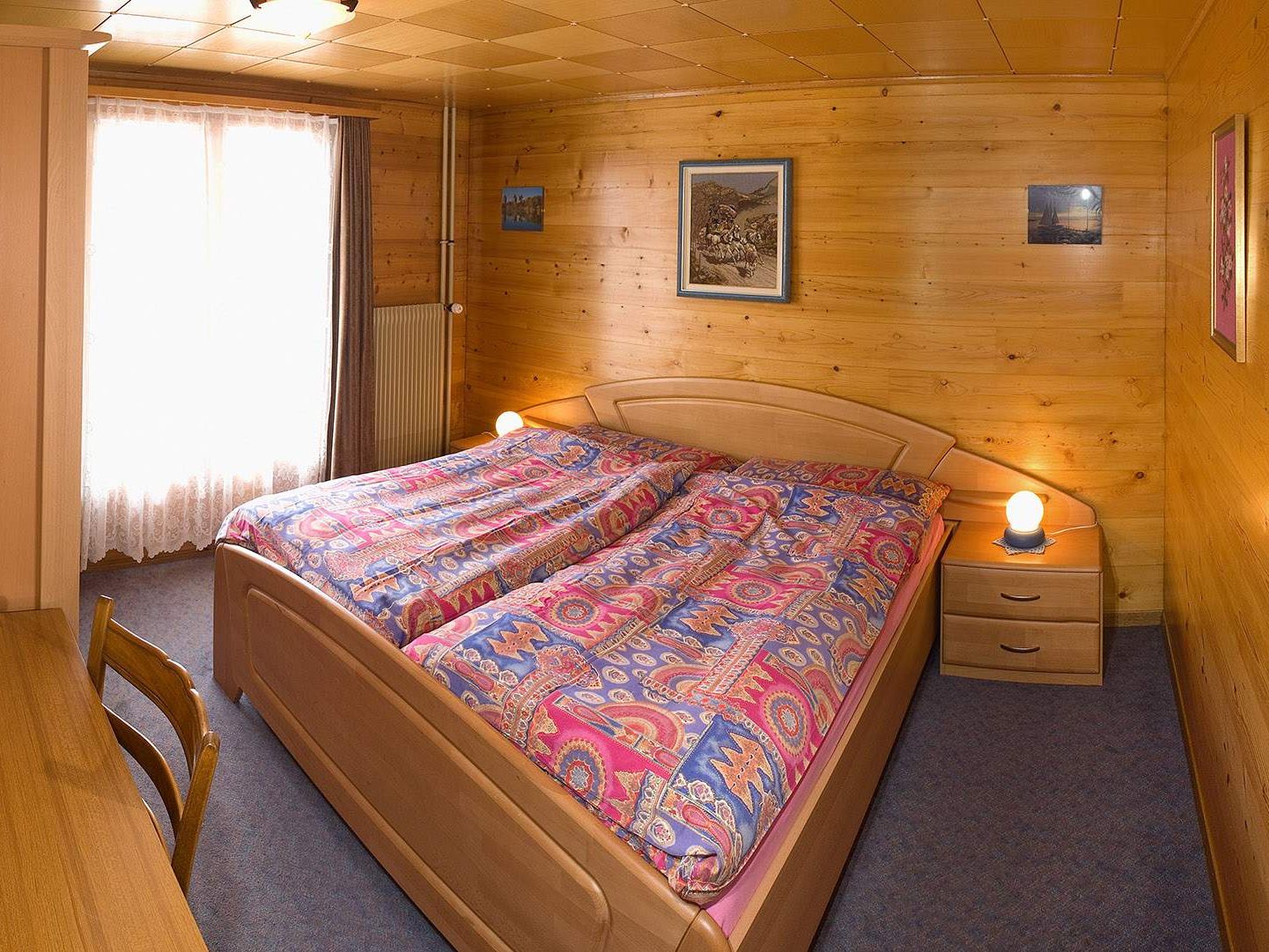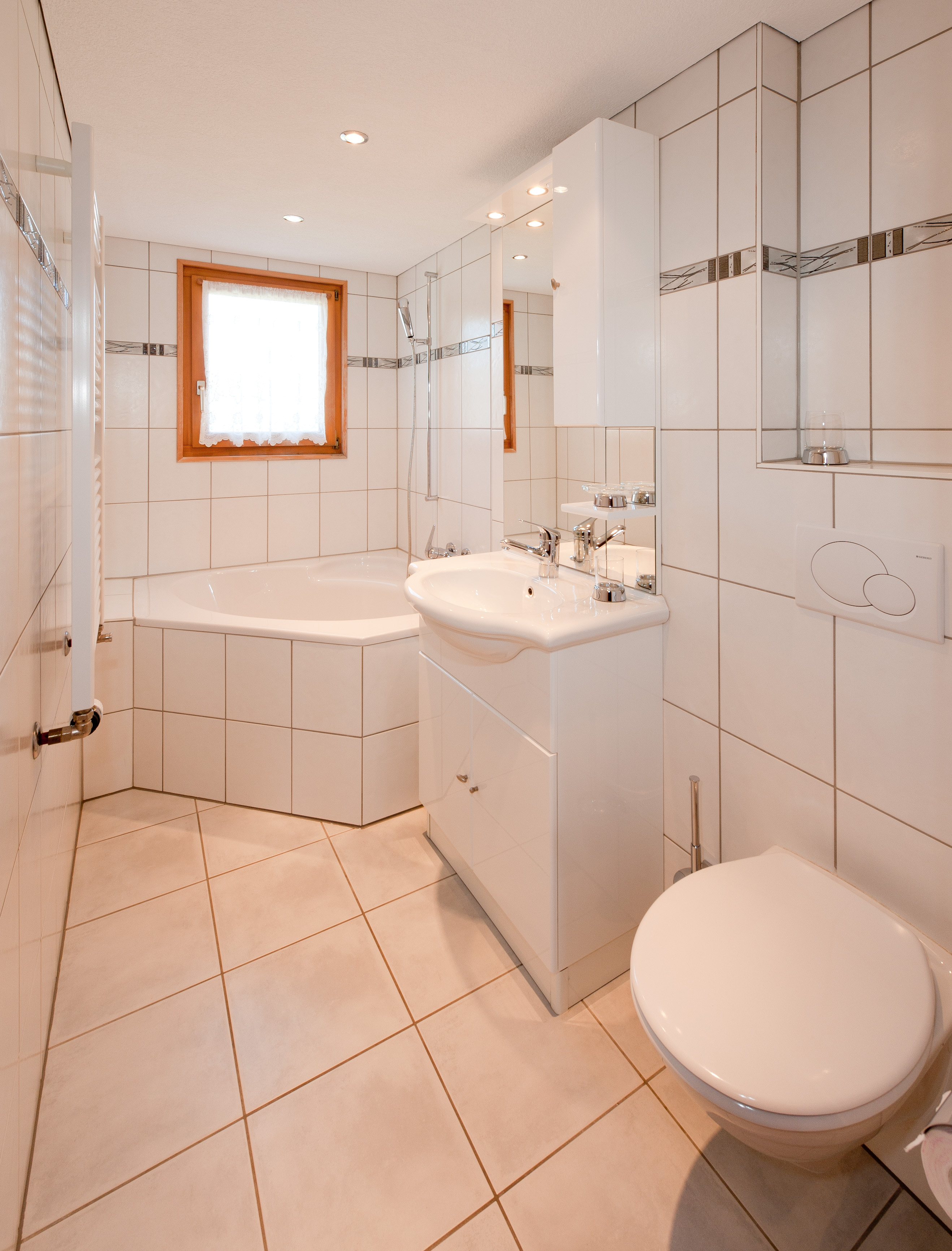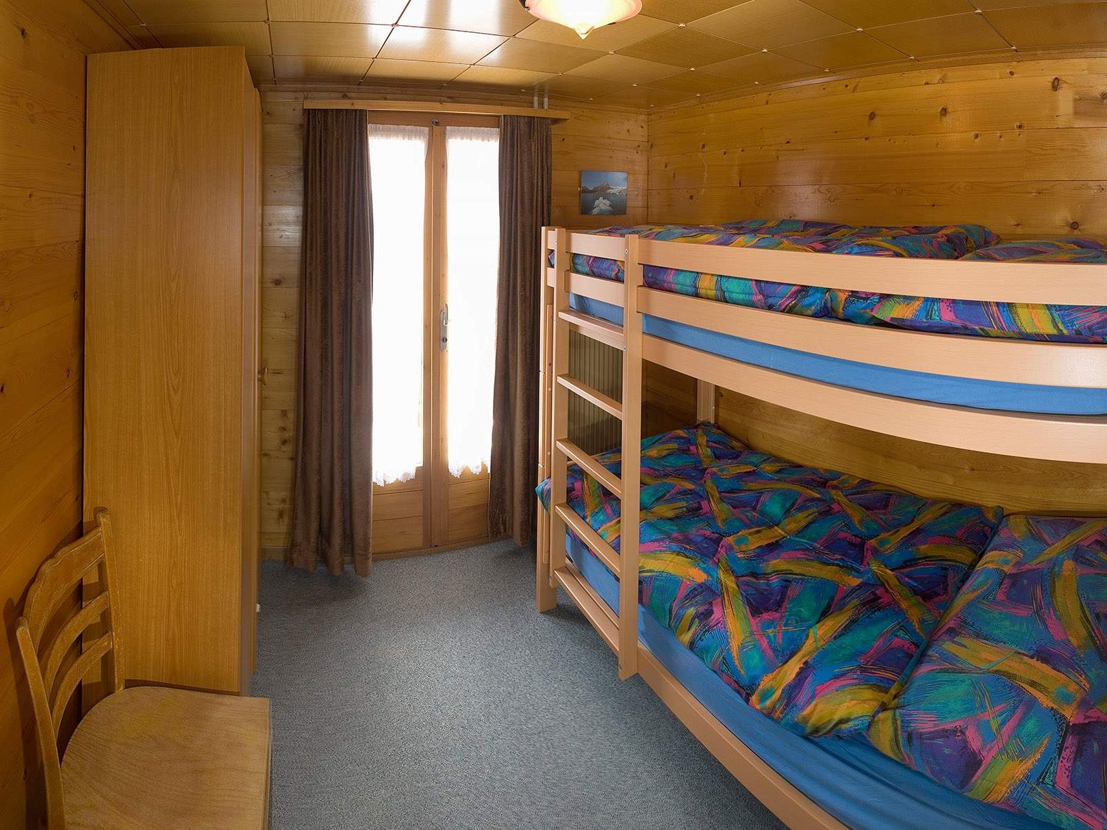 Das 2,5-Zimmer Komfort Apartment im 1. Stock verfügt über: Wohnküche, 1 Schlafzimmer mit französischem Bett (180 cm), 1 Schlafzimmer mit Etagenbett, 1 Kinderbett, 1 Badezimmer mit Badewanne, 1 ausgestatteter Balkon